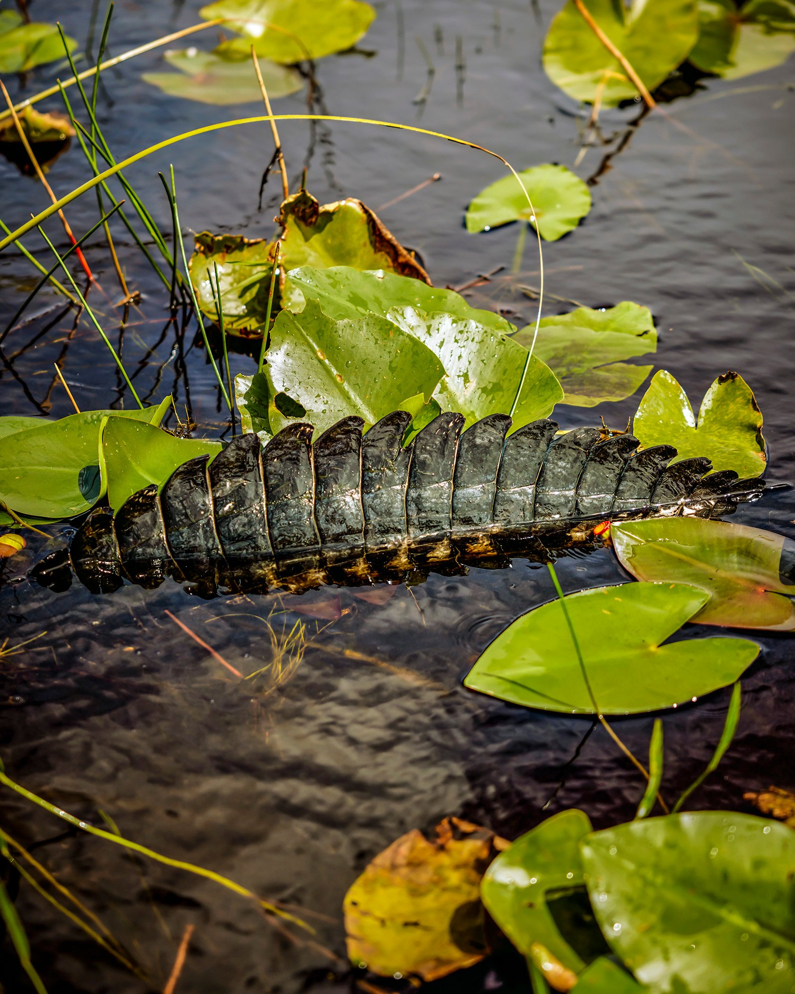 An alligator suns among the swampy waters in the Miccosukee Indian Reservation's portion of the Florida Everglades. June 22, 2024.