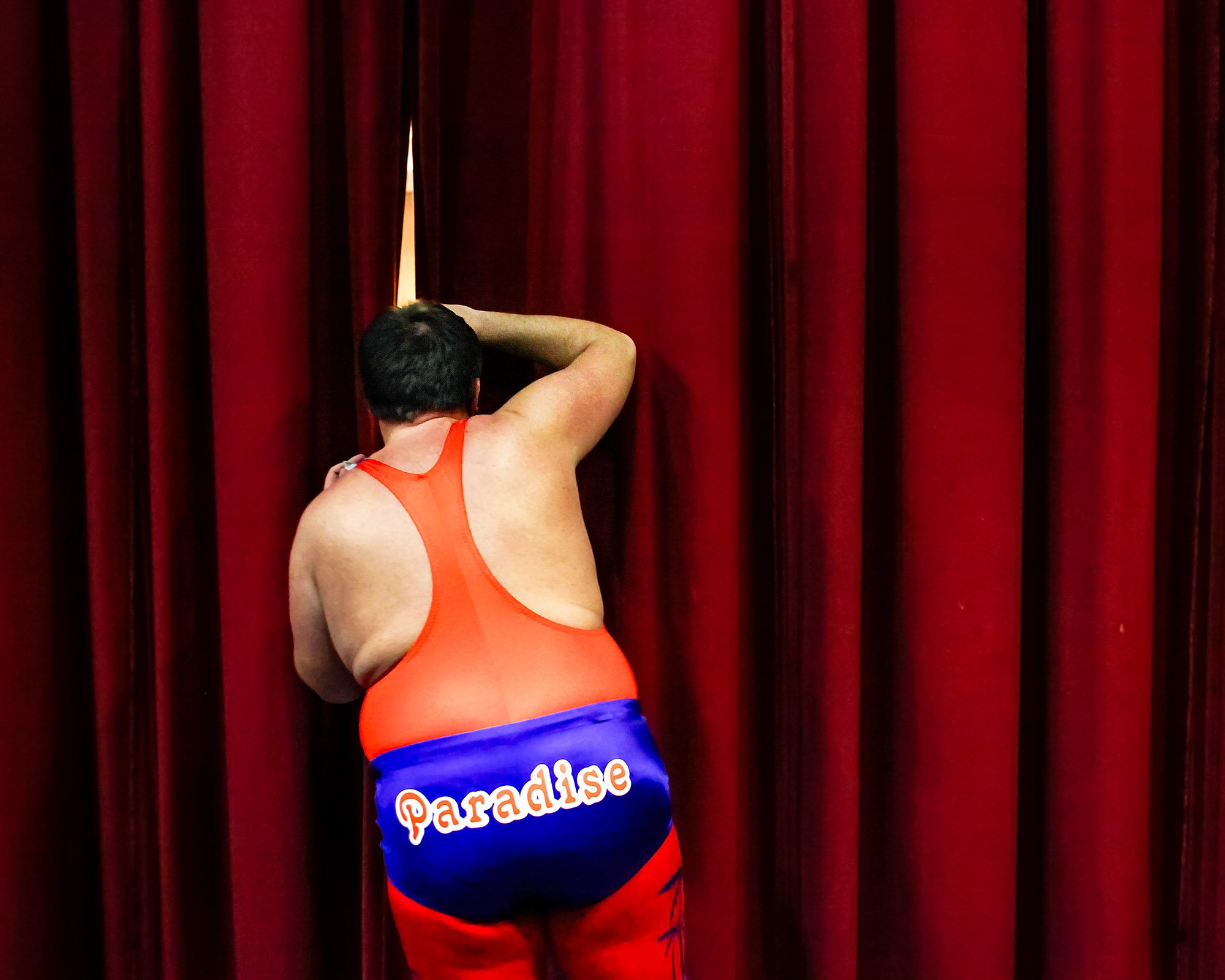 Richie Paradise peeks out to the crowd before taking his stance as the villain in a match with New Era Wrestling in Fort Myers, FL.